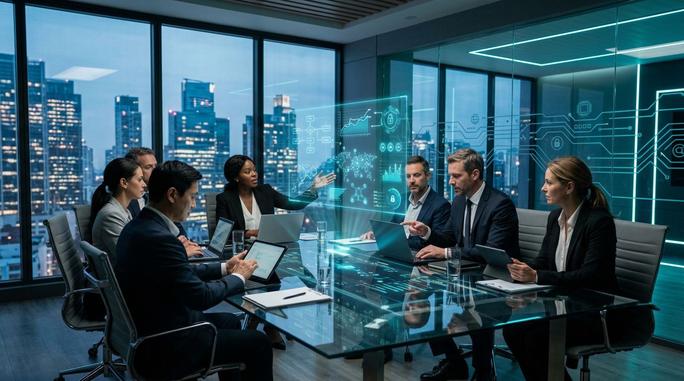 Three diverse professionals in a modern conference room examine an AI business case document spread on a table, laptops nearby with blurred screens, collaborative pose.